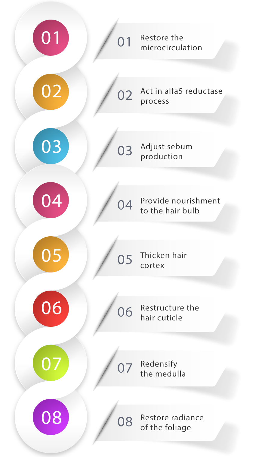 Thanks to the vasodilator activity of its active ingredients, Hair System helps to increase blood flow and therefore to irrigate and oxygenate the scalp. Hair System also contains all the metabolites (vitamins, aminoacids, minerals) required for proper functioning of the nutritional and energetic metabolism.
